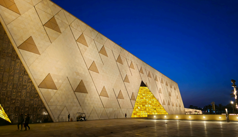 GEM sits on a vast site near Giza — roughly 2 km from the Pyramids — and covers hundreds of thousands of square metres. The building comprises a striking triangular façade, glass, alabaster stone, and large transparent surfaces that allow views of the Pyramids. For example the north and south walls are aligned with the Great Pyramid of Khufu and the Pyramid of Menkaure, creating a strong visual link to ancient monuments. Construction was executed by a joint venture of Egyptian and international firms (including Orascom, BESIX) and required intense coordination to move large statues, fragile artefacts, and design a state-of-the-art conservation centre.